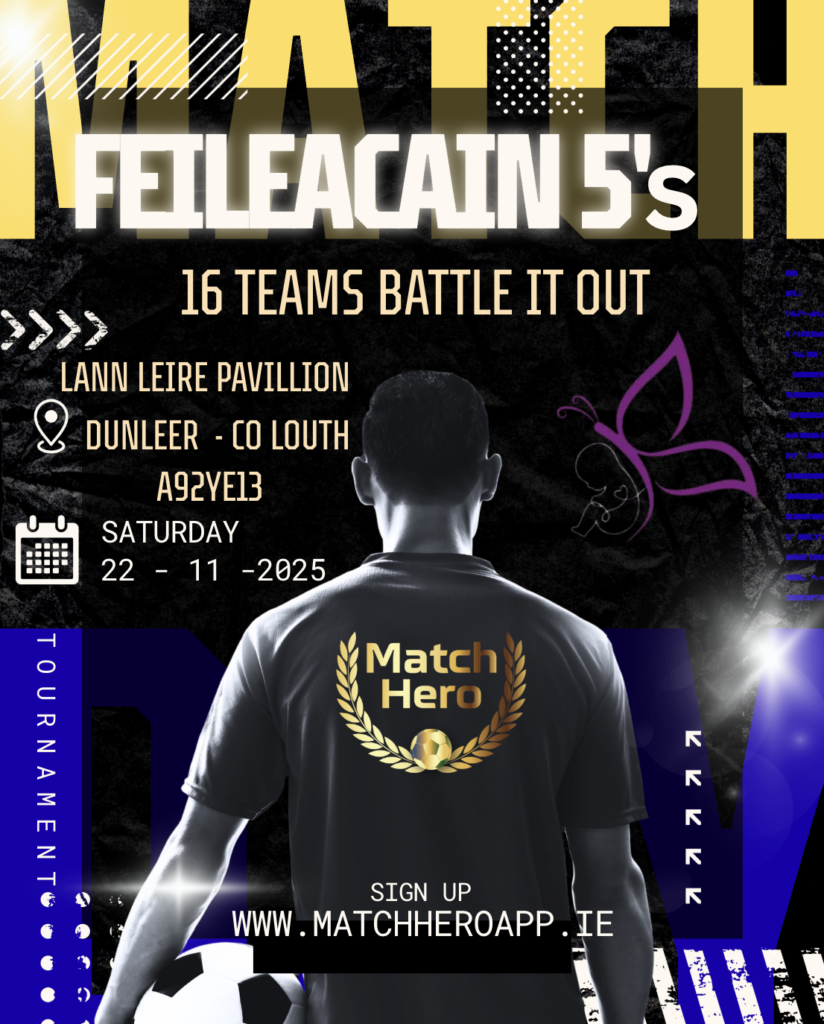 Get ready for an epic five-a-side tournament at Lann Leire Pavilion, Dunleer on November 22nd! Sixteen teams clash in four groups, with top two from each group charging into the knockout stages.